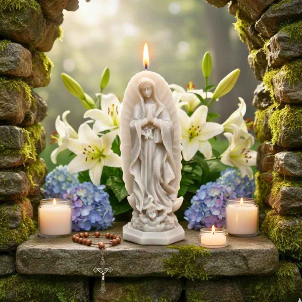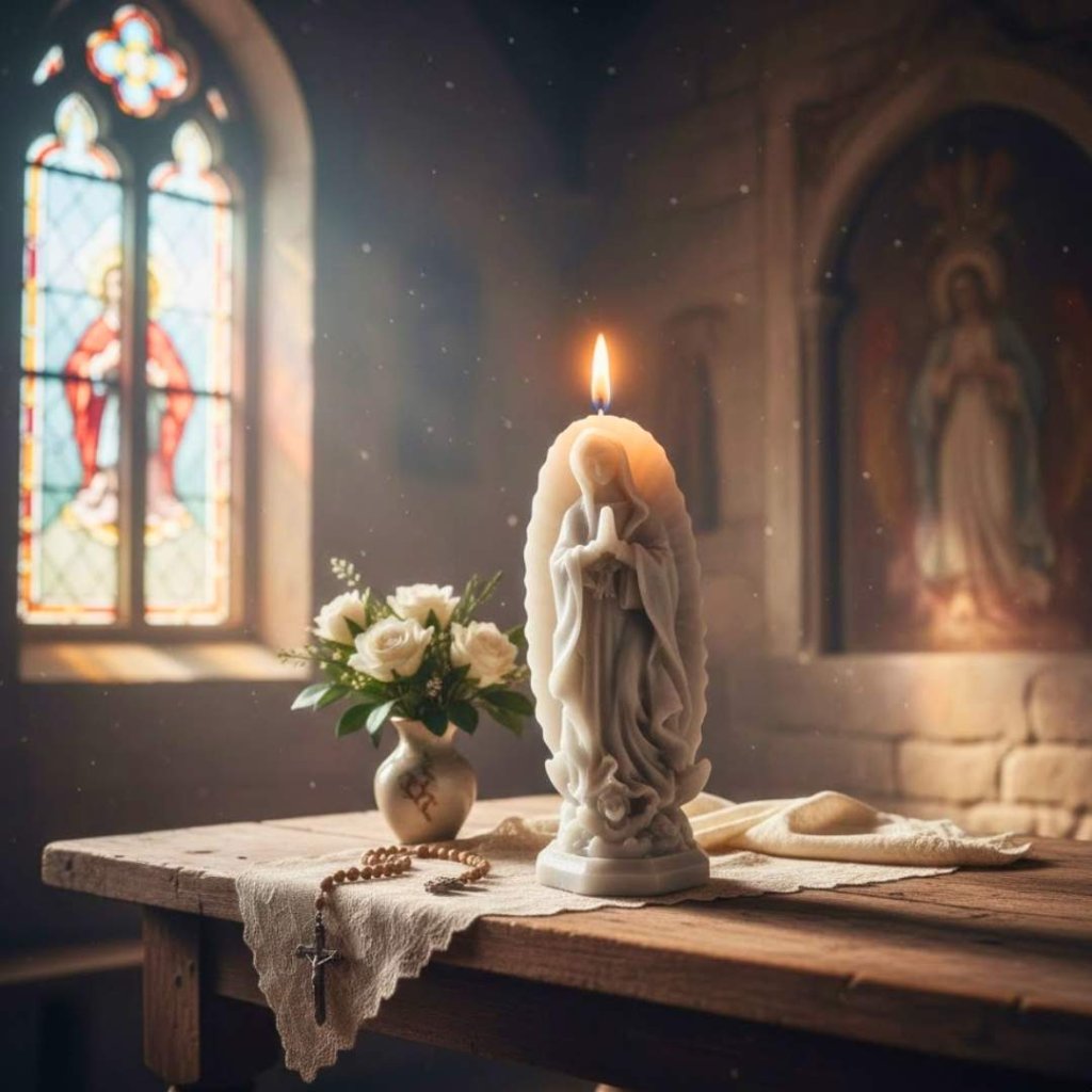 Svíčka ve tvaru Panny Marie hoří přibližně 2 hodiny. Doba hoření se může mírně lišit podle typu vosku a podmínek při hoření.