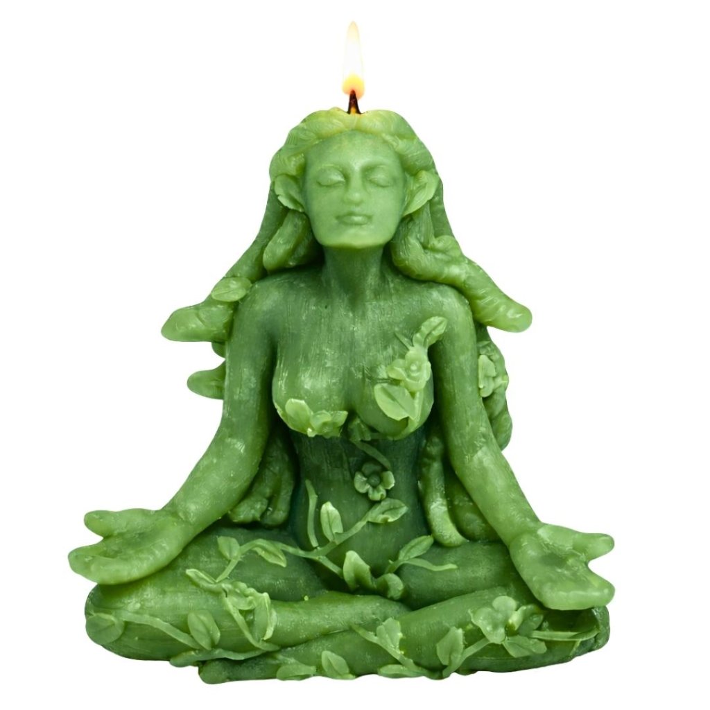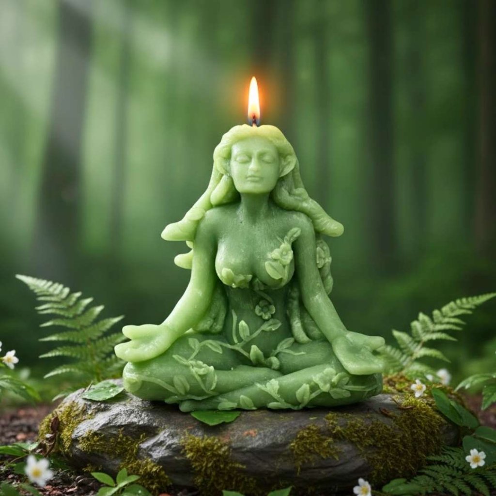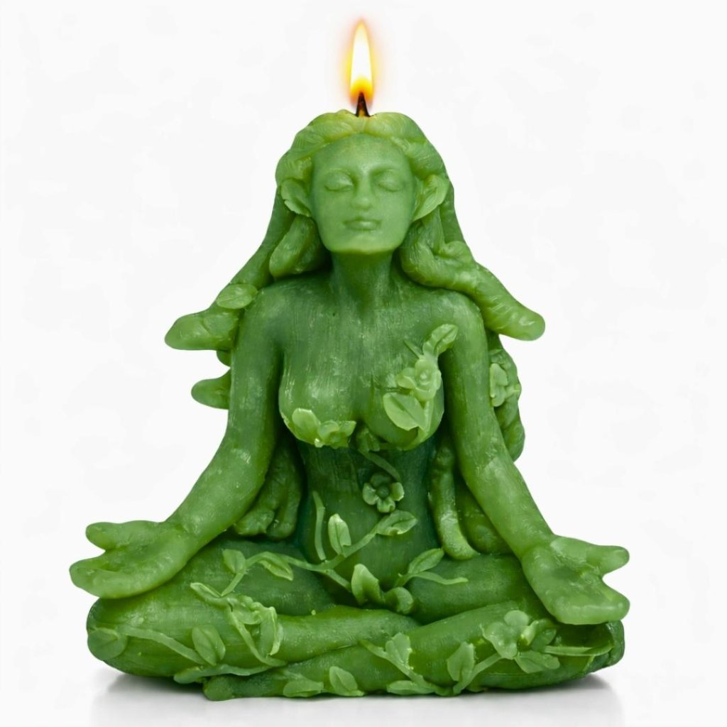 Vonná ručně vyráběná nádherná svíčka zobrazuje ženu v meditativní poloze, obklopenou stonky s listy jako vlasy, které se splétají jako hadi. Je to pocta přírodní kráse a mystice, kterou Matka Příroda ztělesňuje.