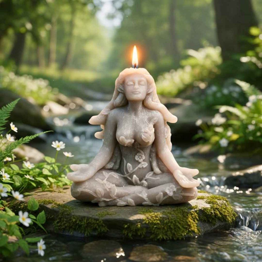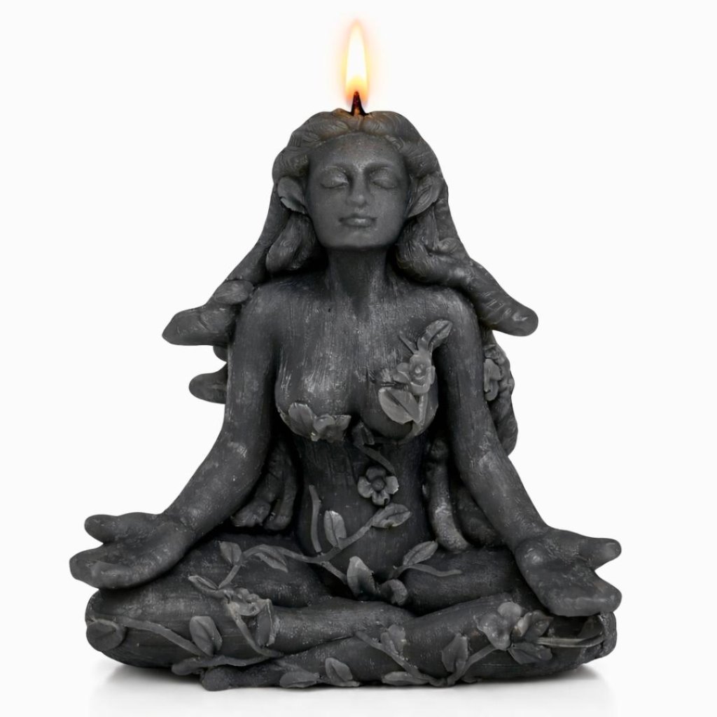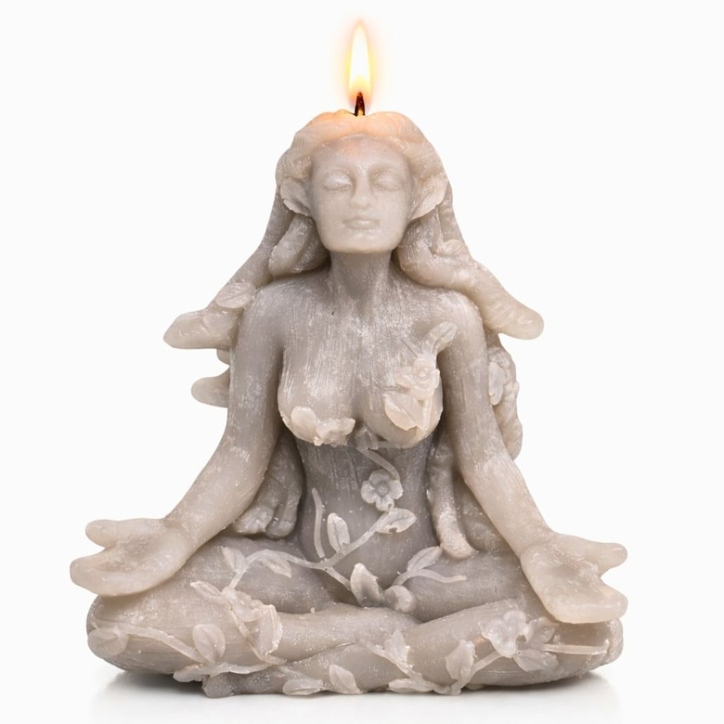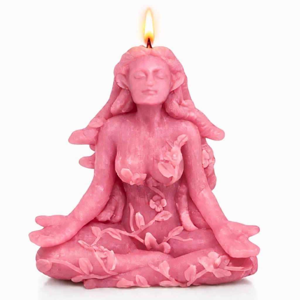 Vonná ručně vyráběná nádherná svíčka zobrazuje ženu v meditativní poloze, obklopenou stonky s listy jako vlasy, které se splétají jako hadi. Je to pocta přírodní kráse a mystice, kterou Matka Příroda ztělesňuje.