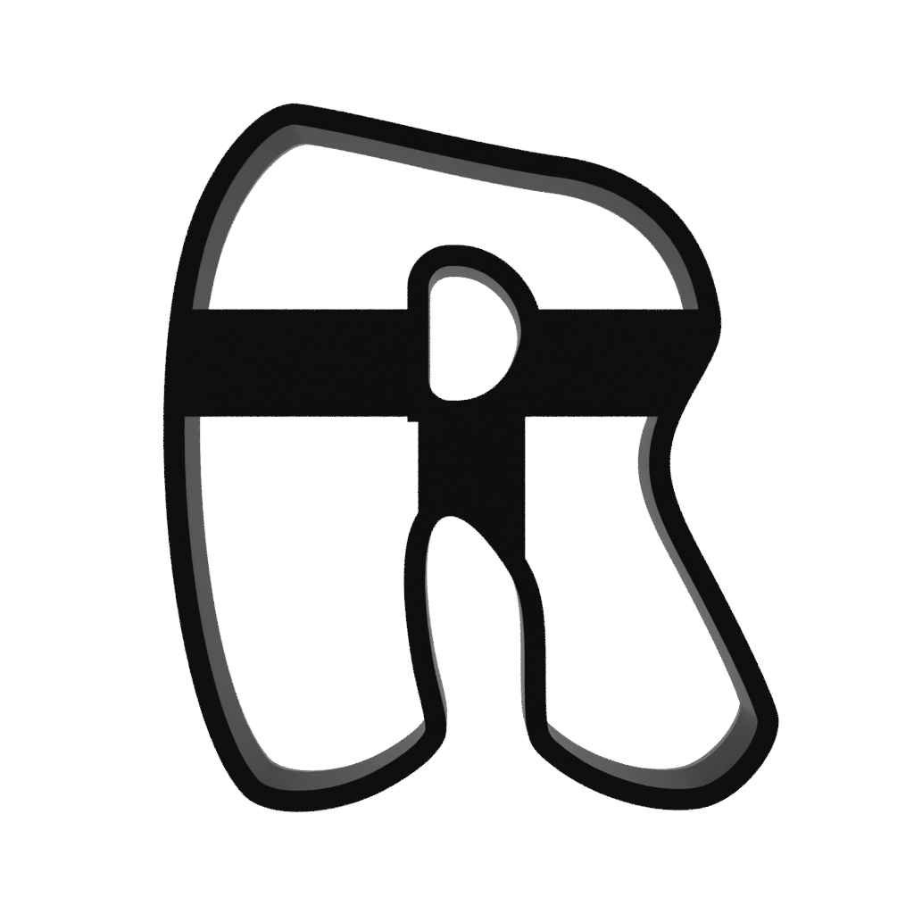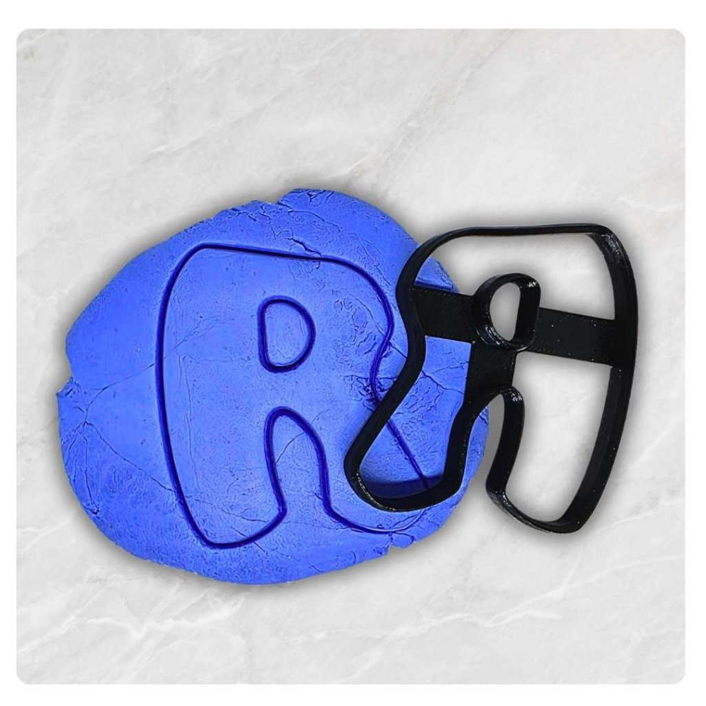 Plastové vykrajovátko, ve tvaru písmenka R vyrobeného z certifikovaného plastu vhodného pro styk s potravinami.