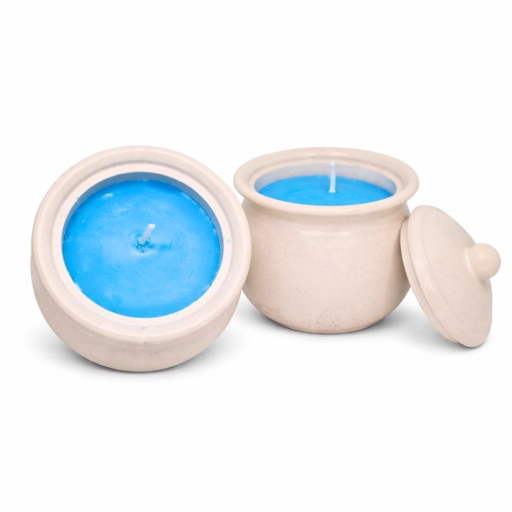 Vonná sójová svíčka v ručně vyrobené betonové nádobě, která zaujme tvarem pohádkového džbánku. Naturální šedý beton džbánku spolu s modrým voskem uvnitř přináší elegantní a uklidňující kombinaci.