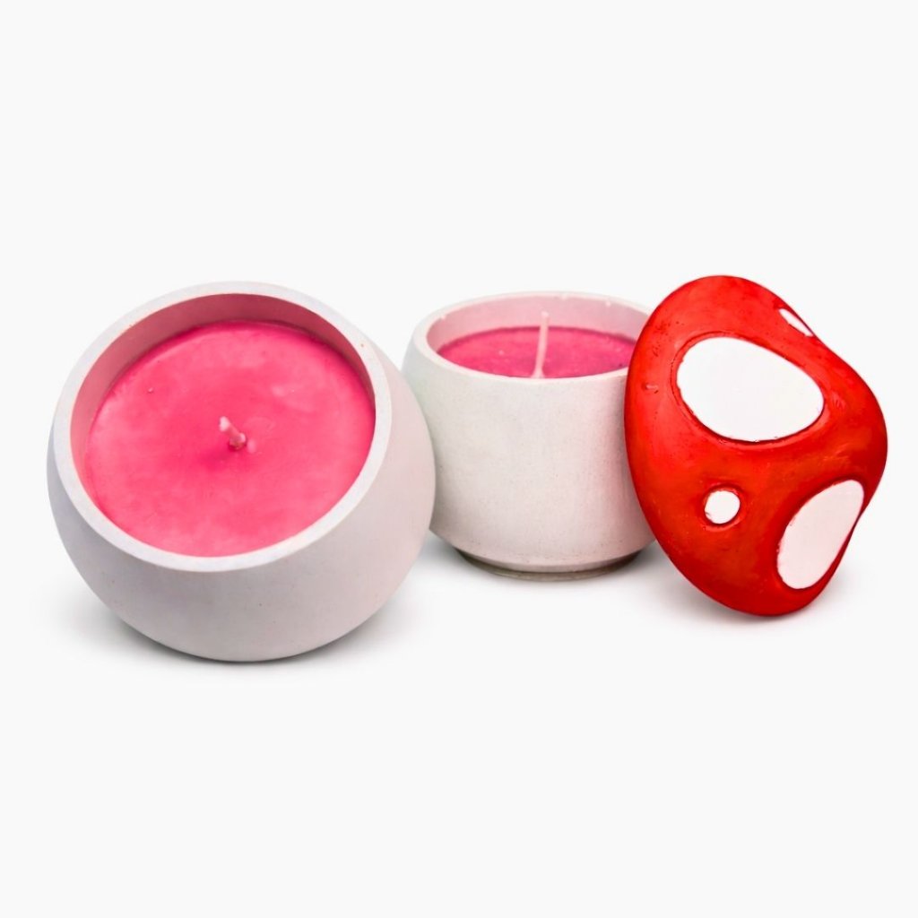 Vonná sójová svíčka v ručně vyrobené a malované betonové nádobě ve tvaru ikonické červené muchomůrky vnese do vašeho domova hravost a kouzlo lesa.