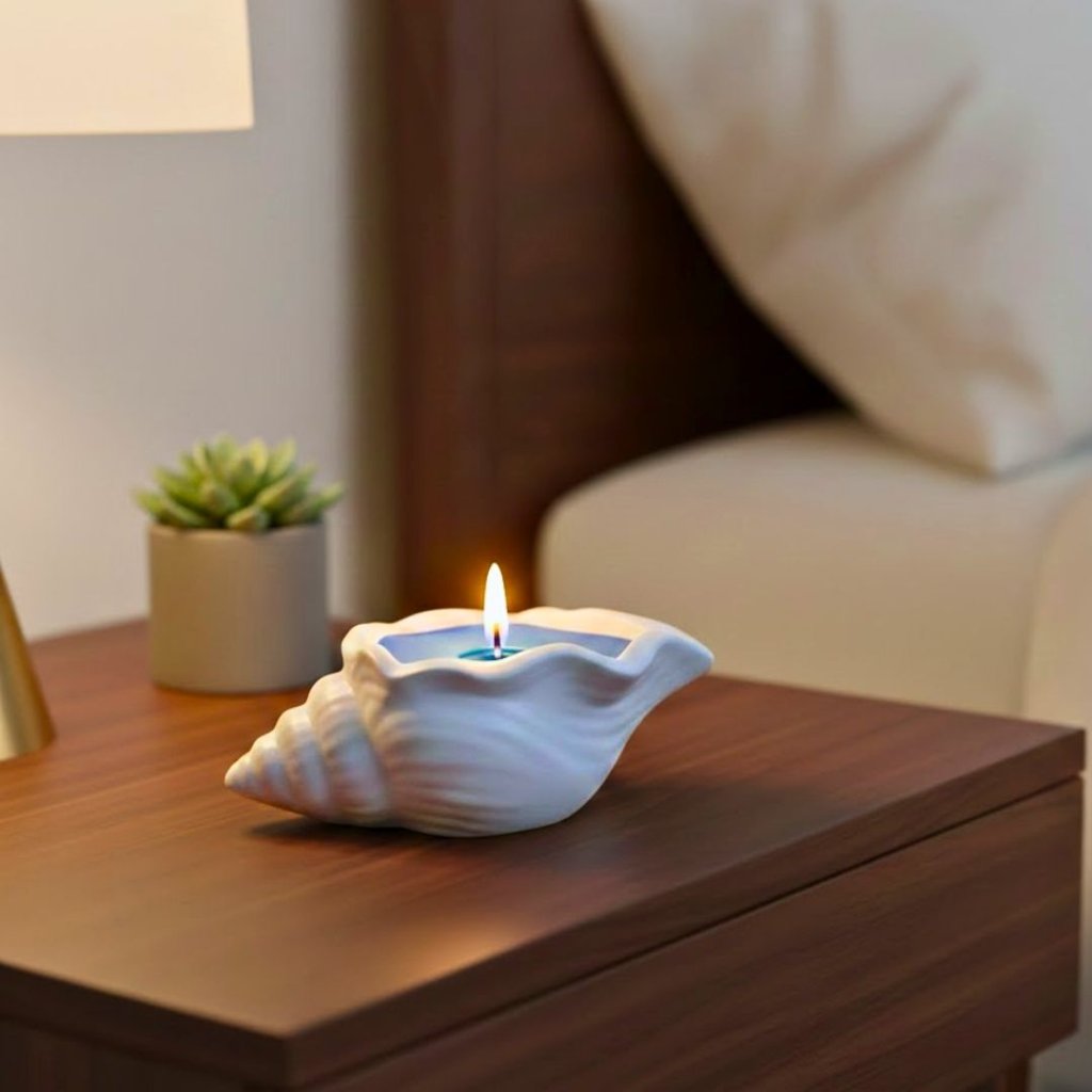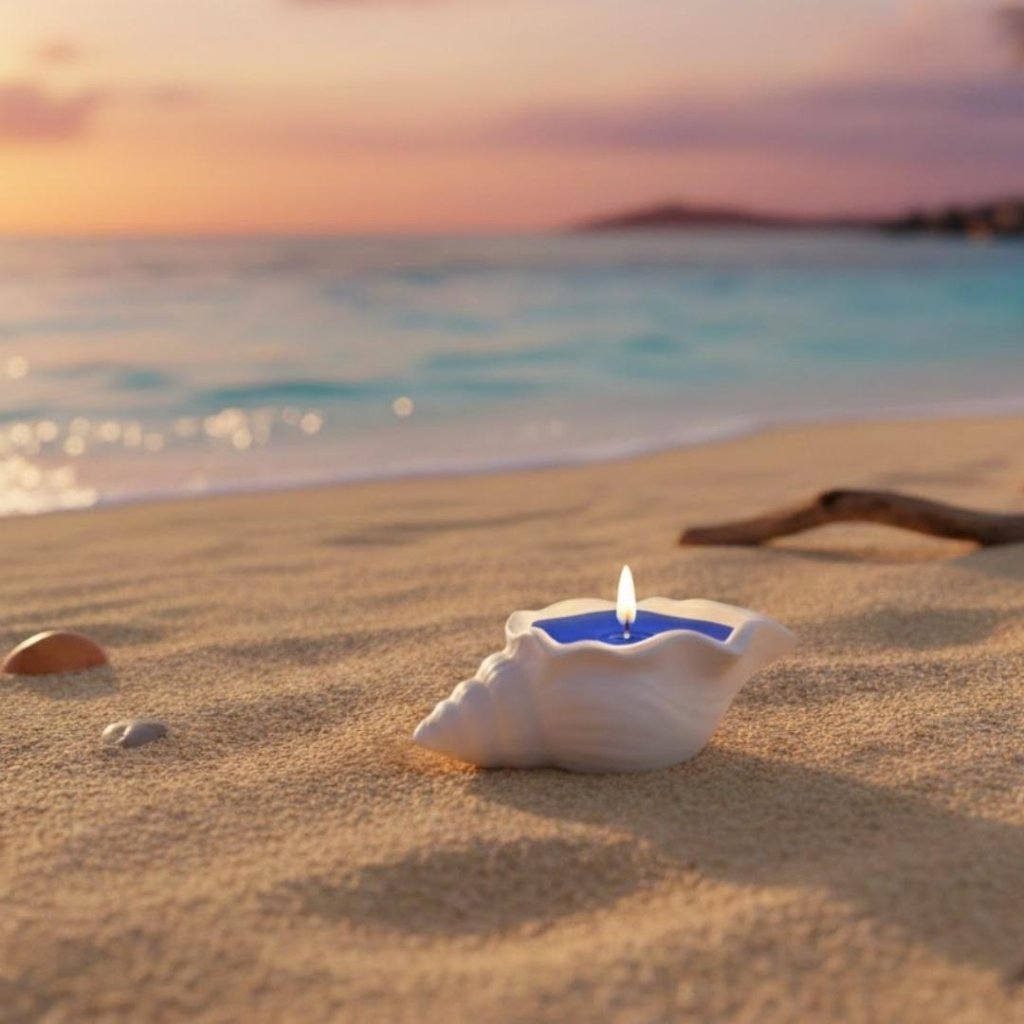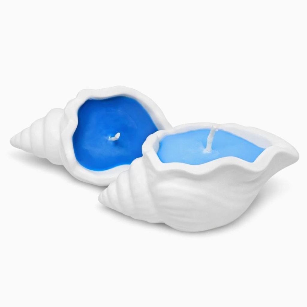 Sójová vonná svíčka v betonové nádobě ve tvaru mušle v její přirozené, naturální barvě. Modrý vosk uvnitř symbolizuje mořskou vodu.