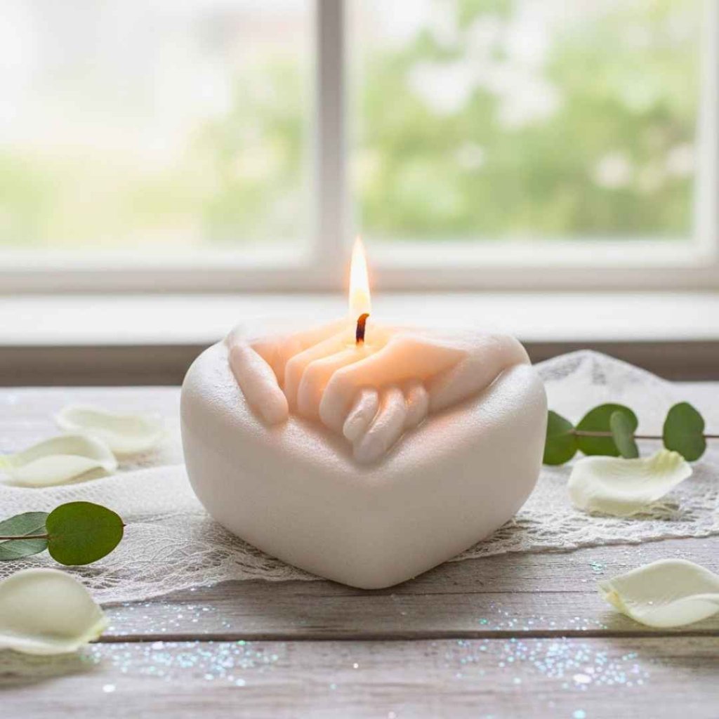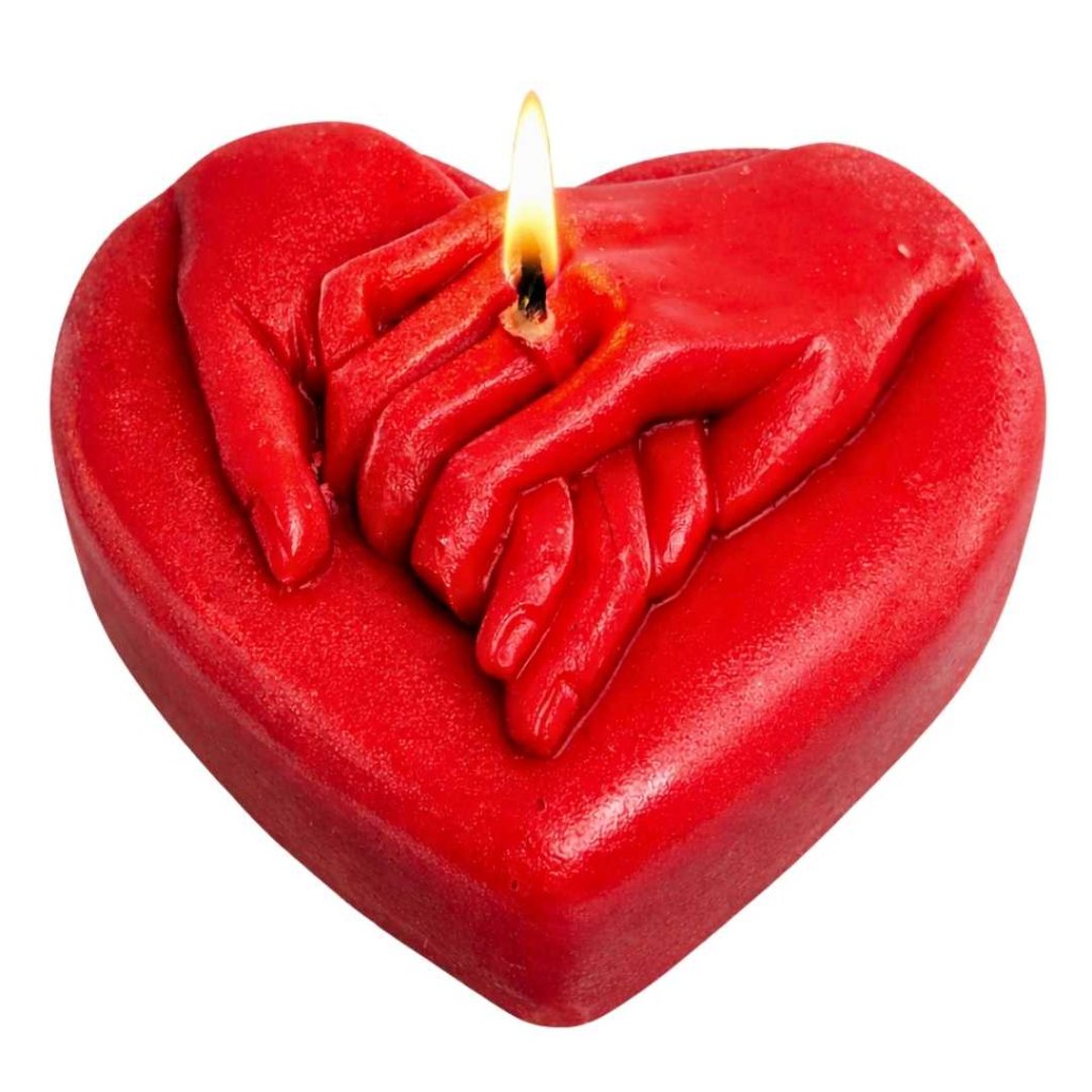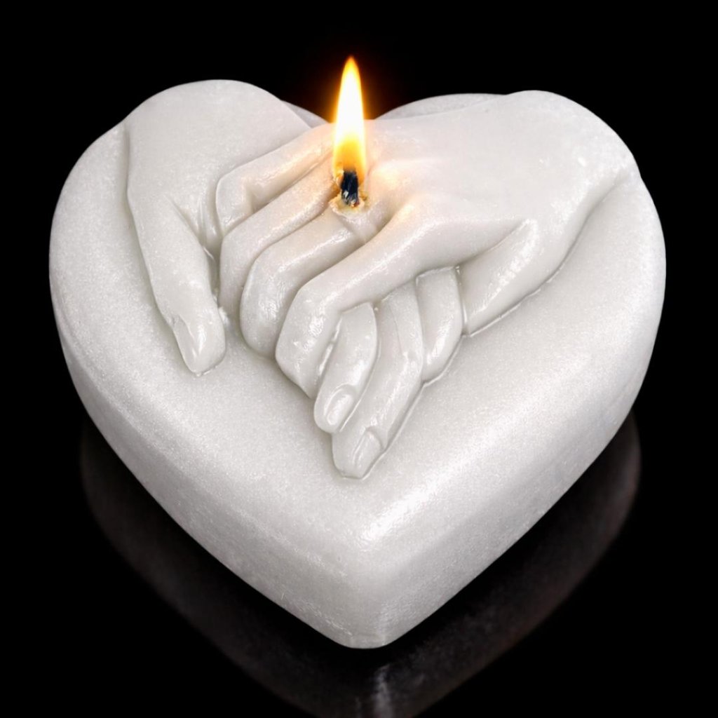 Oslavte váš vztah a lásku s naší originální handmade svíčkou pro novomanžele. Romantická svíčka představuje spojené ruce v dlani, které na sobě mají nasazené snubní prsteny.