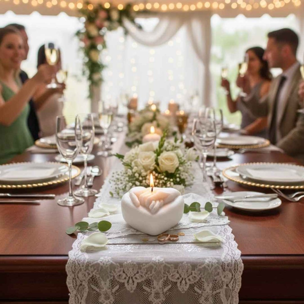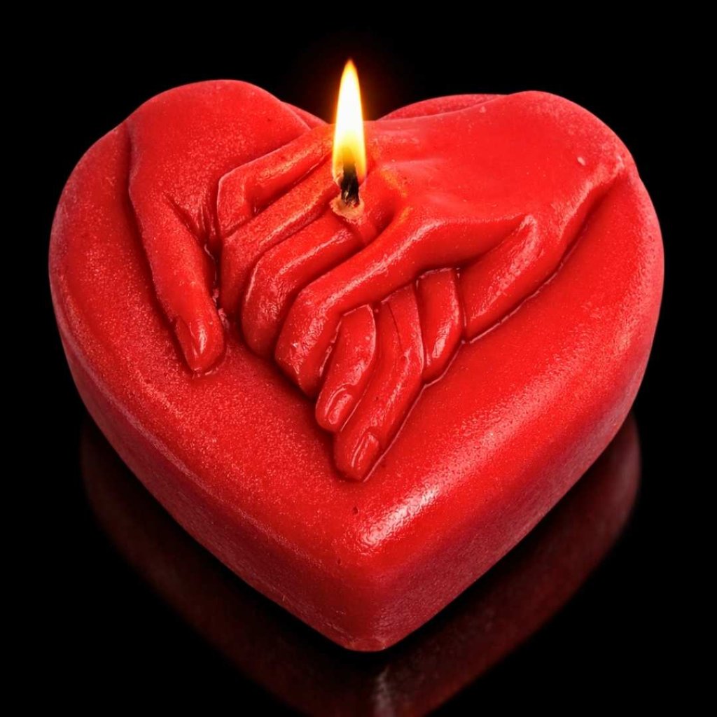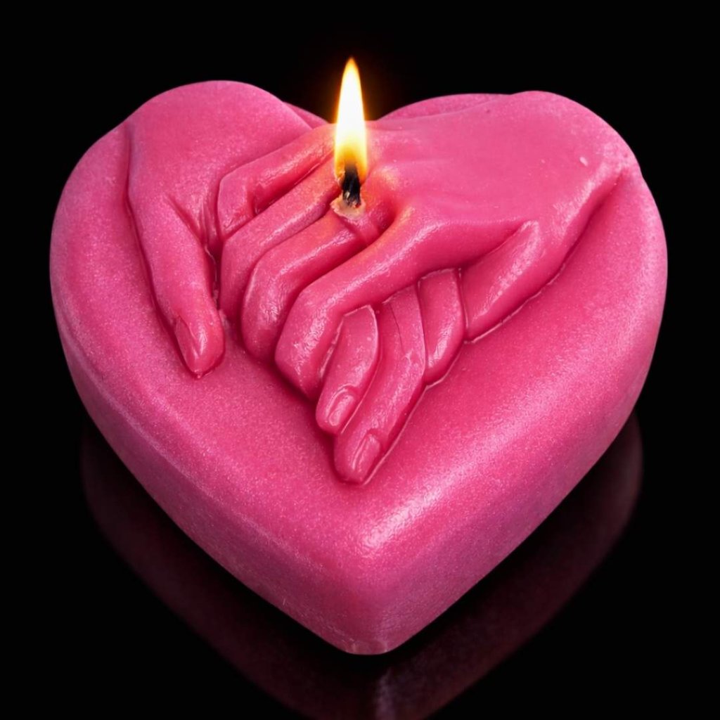 Oslavte váš vztah a lásku s naší originální handmade svíčkou pro novomanžele. Romantická svíčka představuje spojené ruce v dlani, které na sobě mají nasazené snubní prsteny.