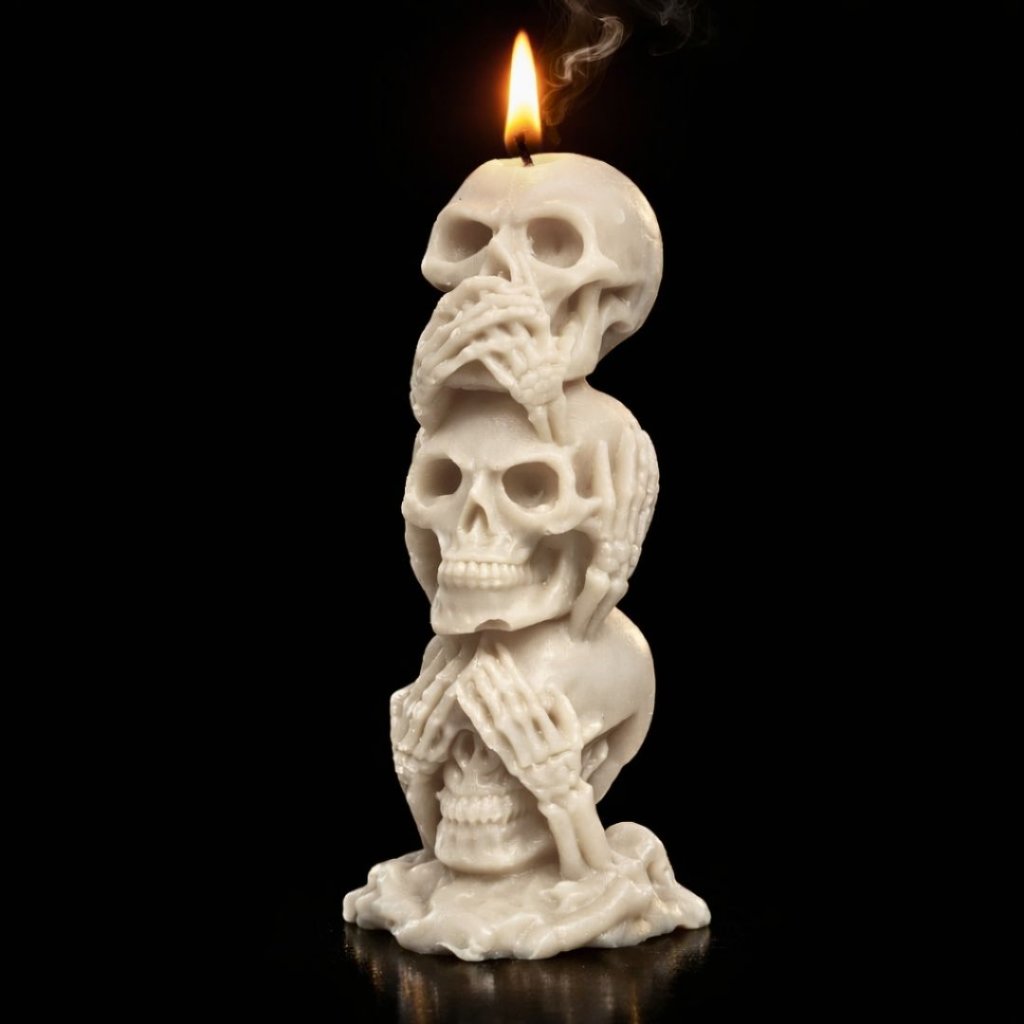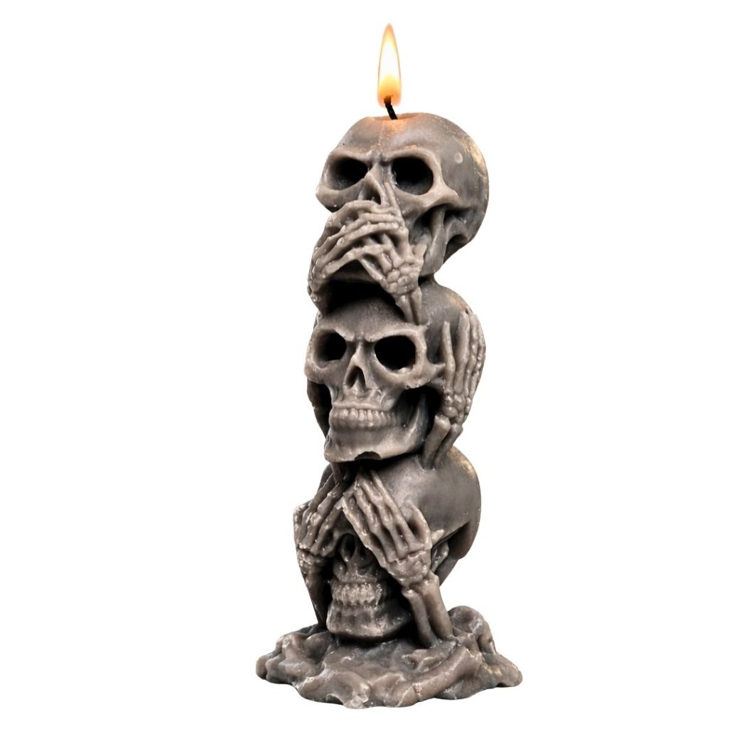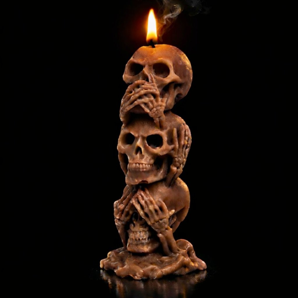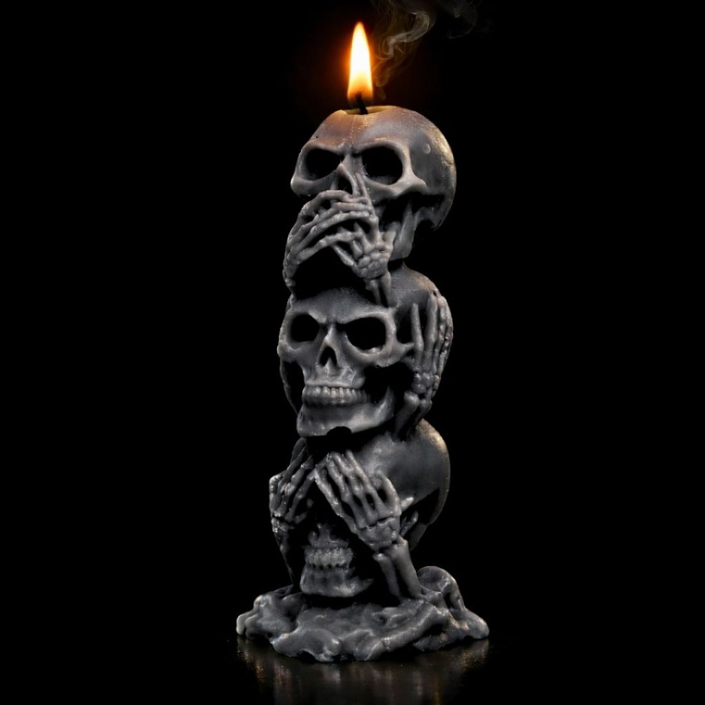 Symbolická svíčka tří moudrých lebek v temném pojetí připomíná nadčasové poselství morálky, ticha a vnitřní rovnováhy. Výrazný dekorační prvek s hlubším významem.