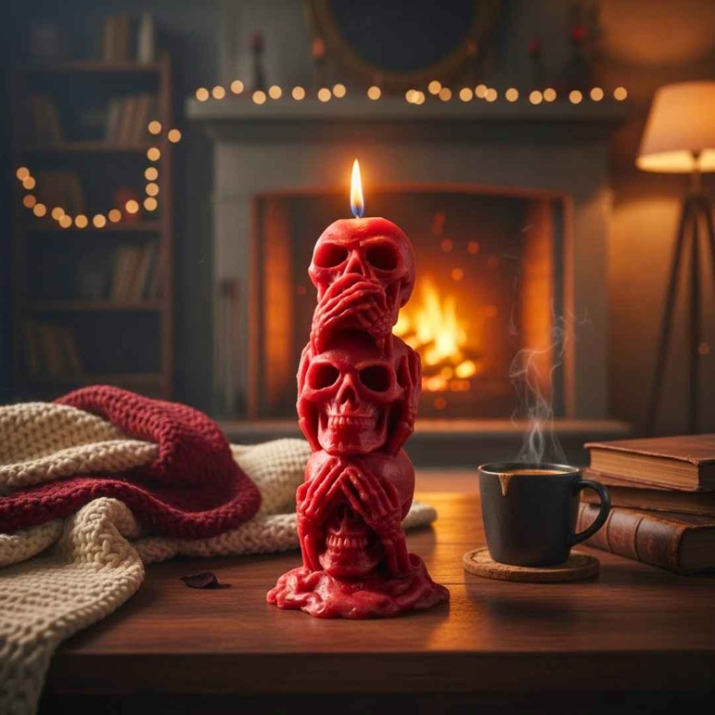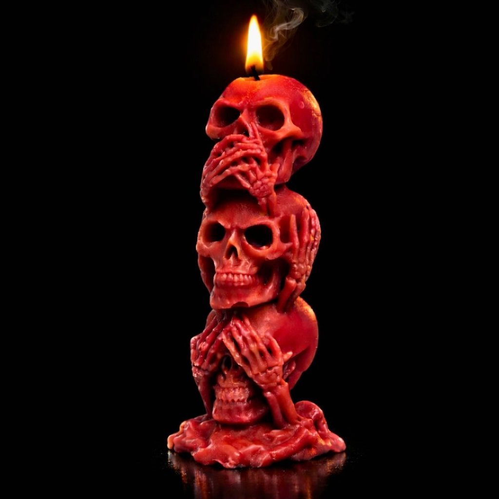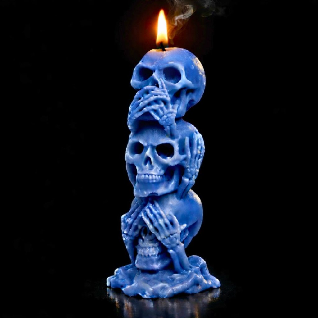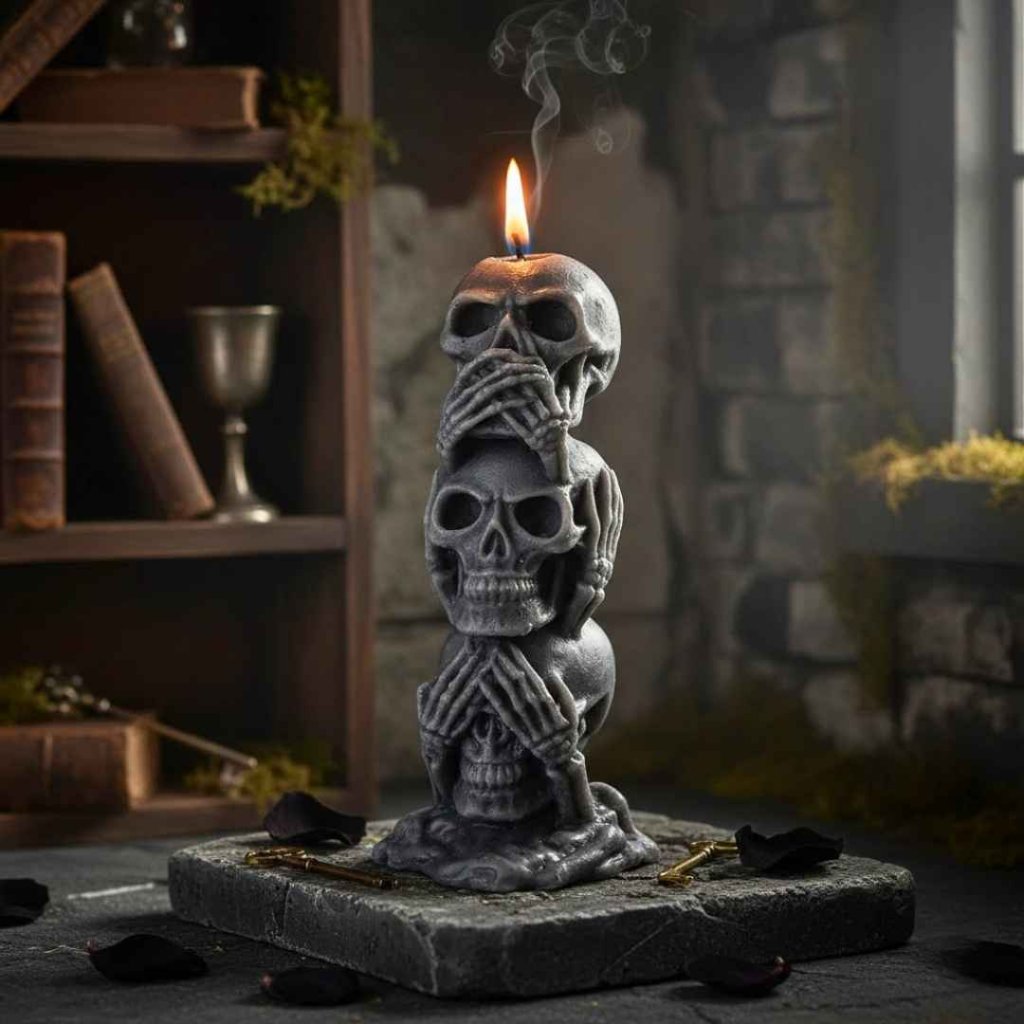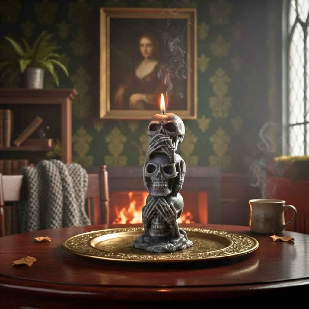 Symbolická svíčka tří moudrých lebek v temném pojetí připomíná nadčasové poselství morálky, ticha a vnitřní rovnováhy. Výrazný dekorační prvek s hlubším významem.